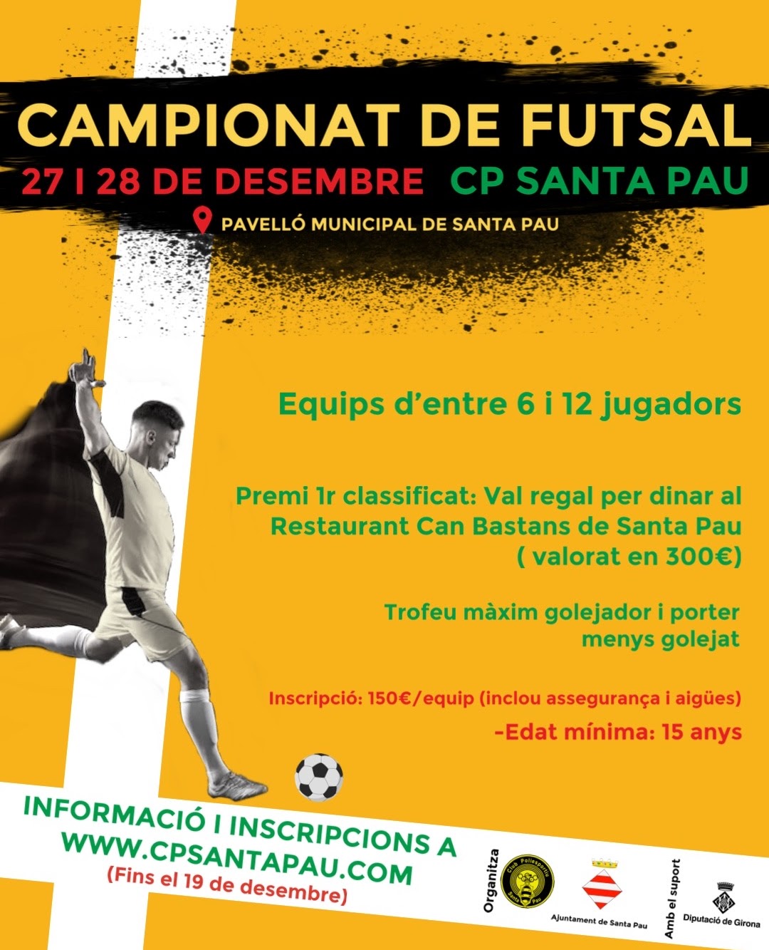 El 27 i 28 de desembre es disputarà el III Campionat de Futsal de Nadal a Santa Pau. Infromació bàsica: Equips d'entre 6 i 12 jugadors Premi 1r Classificat: Val regal per dinar al Restaurant Can Bastants de Santa Pau valorat en 300€. Premi al jugador amb més gols del campionat Premi al porter menys golejat del campionat Els equips poden ser masculins, femenins o mitxes…